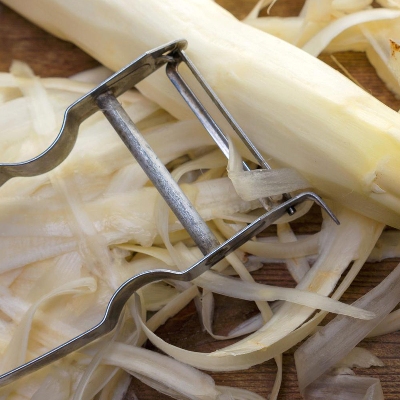 Ook voor winterwortelen, appels en zelfs de asperges. Die laatste schil ik zelfs liever met deze schiller dan met een aspergeschiller waar ik voortdurend ruzie mee heb. Heel simpel, ik leg de asperge op een omgekeerd pannetje op het aanrecht, hou hem vast bij het koppie en schil ongeveer een cm vanaf de kop naar de kant waar de asperge afgestoken is. Doordat de asperge op het pannetje ligt kan je hem makkelijk draaien en ondersteunen en zal hij minder snel breken. Het werkt heel erg makkelijk. Kijk hier voor tips.