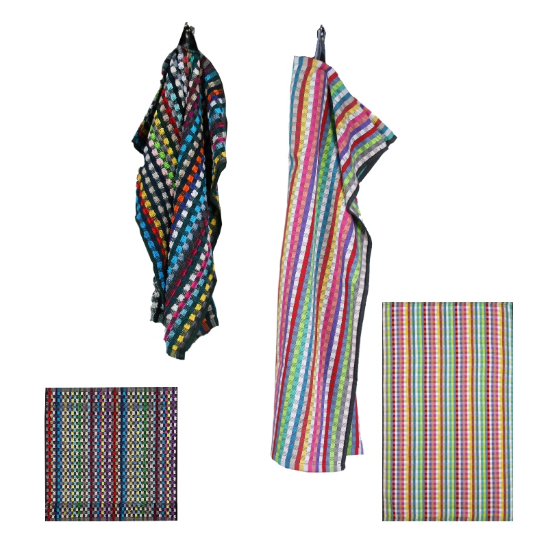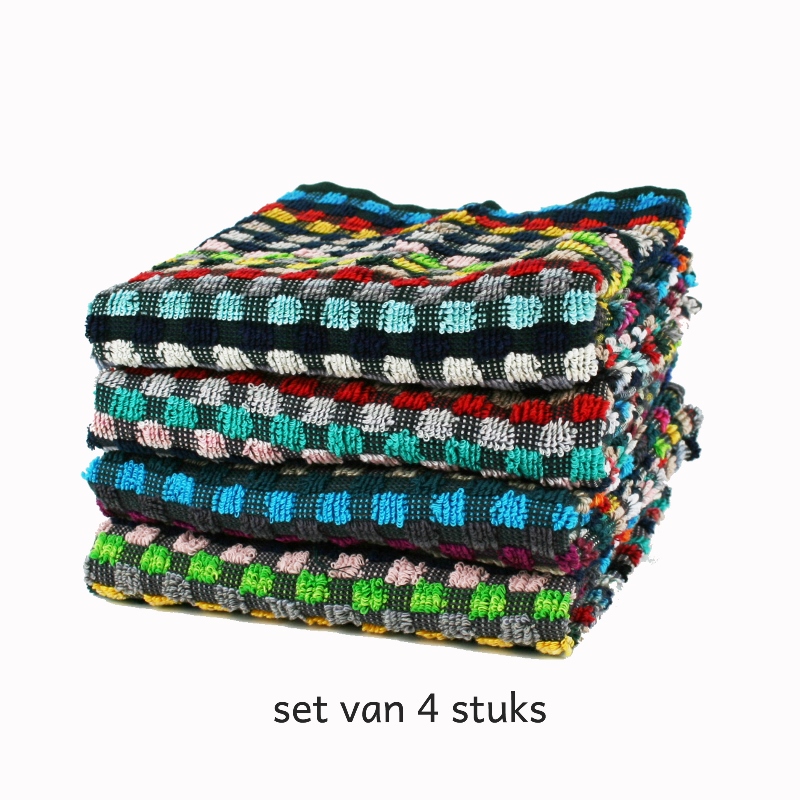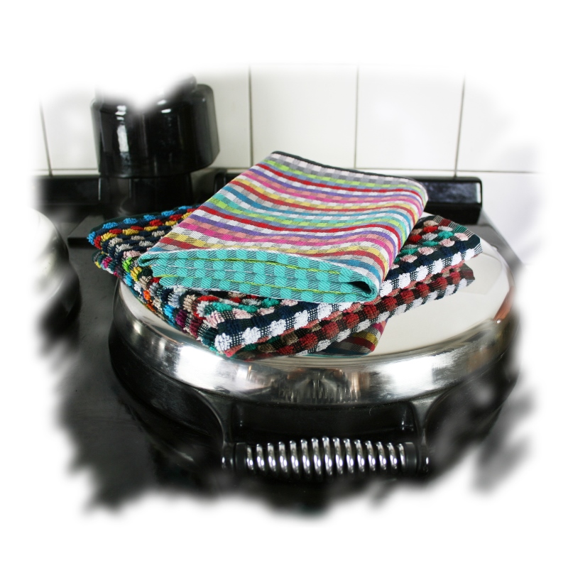 Keukendoek voor in de keuken. Een vierkante handdoek of een langwerpige theedoek en dan in vrolijke kleuren. Gemaakt van 100% katoen restgaren. Omdat het restgaren is zijn de kleuren variabel en de geleverde kleuren kunnen afwijken van de kleuren die op deze website zijn afgebeeld. Reserveringen van bepaalde kleurcombinaties kunnen helaas niet worden gemaakt.