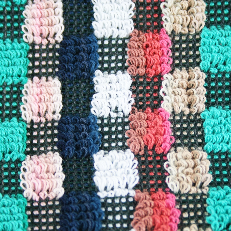 Deze keukendoek is van katoen, en gemaakt van restjes garen. Duurzaam dus, maar bovenal ouderwets zacht en absorberend en met een gezellig fleurig patroontje.