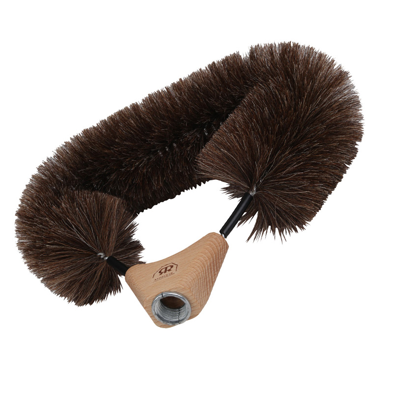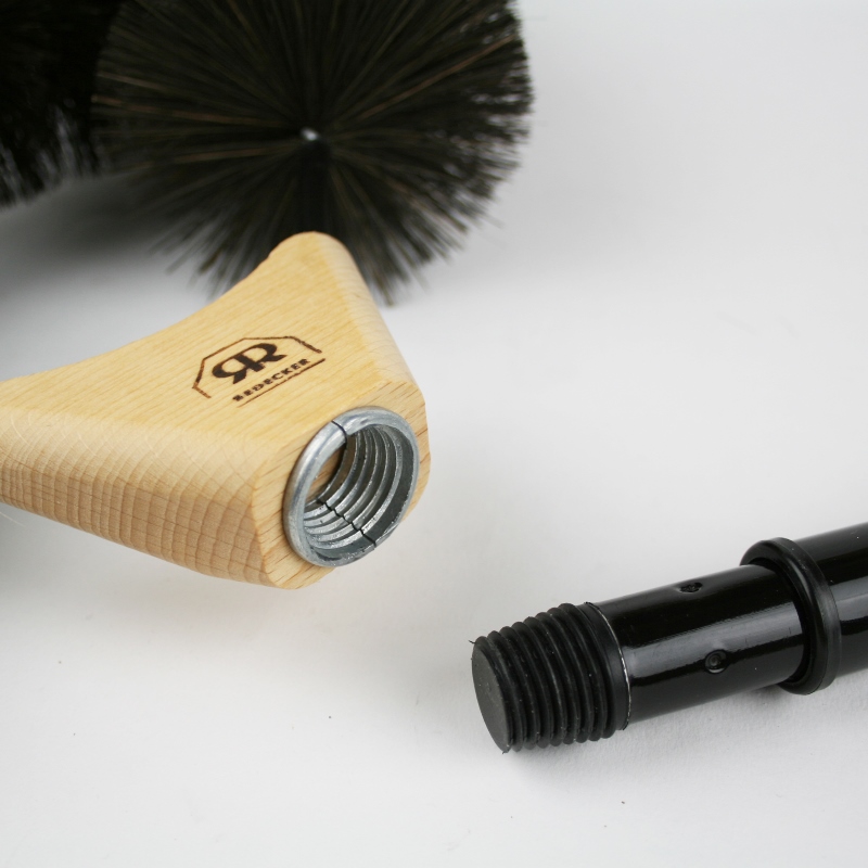 De basis is gemaakt van geolied beukenhout en de haren zitten stevig in metaal gedraaid. Het metalen deel is bovendien voorzien van bescherming zodat je geen krassen of deuken kunt krijgen in kwetsbare oppervlakken. In de basis zit een schroefdraad van 24 mm om een steel in te draaien. Dat kan een steel zijn die je al in huis hebt, of gebruik de telescopische steel die je er bij kunt aanschaffen. Het is een gangbare schroefdraad (duimse schroefdraad) maar ik kan uiteraard niet garanderen dat het altijd past.