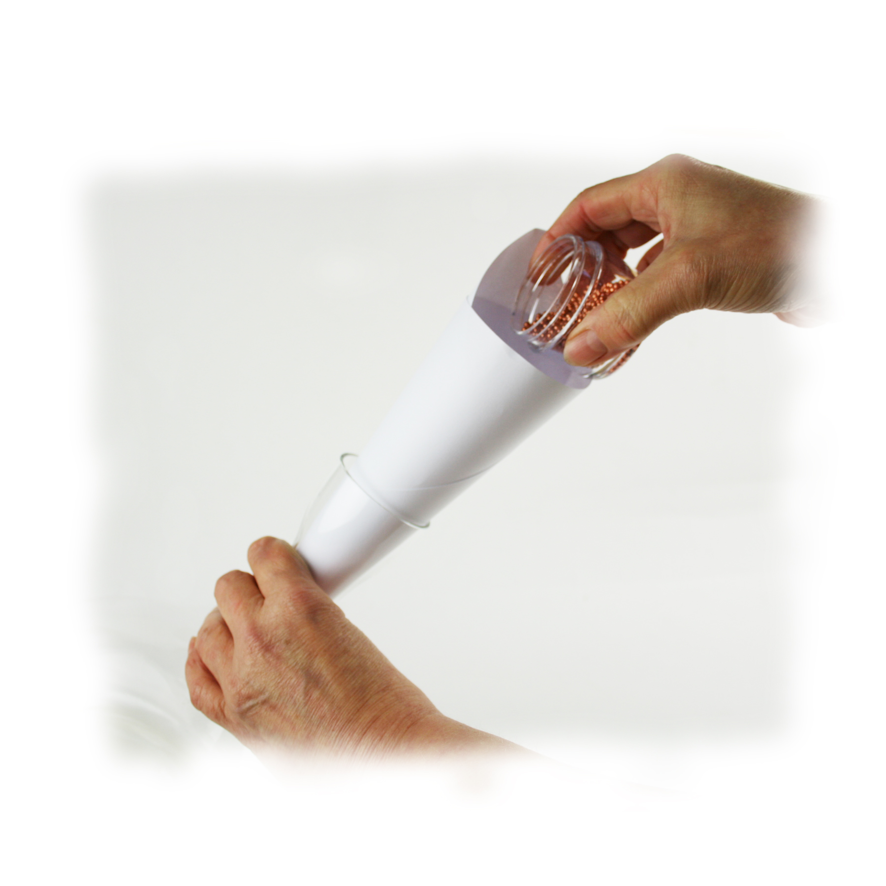 Je laat (voorzichtig doseren) de parels in de karaf of vaas glijden. Dat gaat heel makkelijk als je een A4 papiertje tot een toetertje rolt en die in de opening steekt. Je maakt dan zelf een trechter. Hou de vaas of karaf schuin zodat de parels niet te veel vaart maken met in de vaas rollen want je wil natuurlijk geen ongelukken.