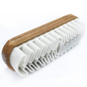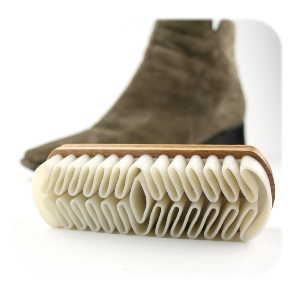 Deze borstel is gemaakt van gelakt beukenhout en heeft geen haren maar een zogenaamde crêpe van natuurrubber. Crêpe betekend dan eigenlijk ‘dun’ en dat slaat op de dunne lint van rubber die in een soort slinger aan het handvat is vastgemaakt en zo precies de juiste weerstand en stroefheid heeft om de korte haartjes van suède of nubuck weer rechtop te laten staan. Omdat de borstel geen haren heeft ruw je als het ware het oppervlakte op zonder vuil verder in de haren te drukken. De borstel heeft een handzaam formaat zodat hij makkelijk in de schoenpoetsdoos- of mand past en biedt een goede grip.