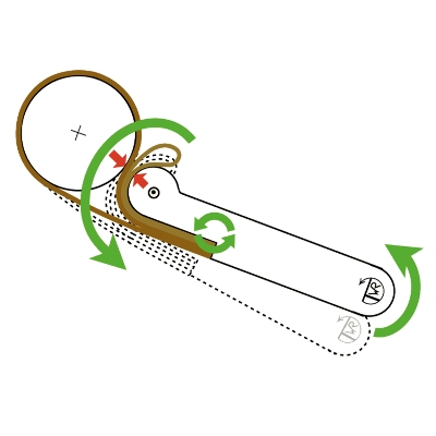 1- Draai in, tegen de richting van de klok in: je beweegt het zilveren oogje van je af en het uiteinde van de hefboom met het logo naar je toe: je elleboog komt naar je toe. Het draaipunt is in je vuist. Het kopje duwt de lus daardoor stevig tegen de rand.