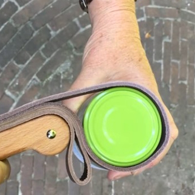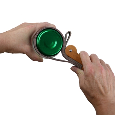 Een beetje eigenaardig ding om te zien deze flesopener; een houten handvat met twee leren lussen. Maar tjonge, het is een handig ding naar mijn hart! Het principe werkt heel simpel (en daar houden we van!): de lus om een deksel heen doen en draaien maar. Door gebruik te maken van hefboomwerking met het handvat heb je elke pot of fles bijna zonder moeite open.